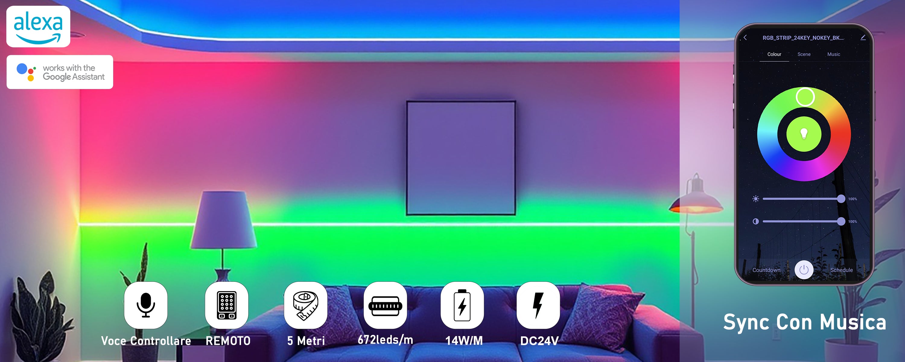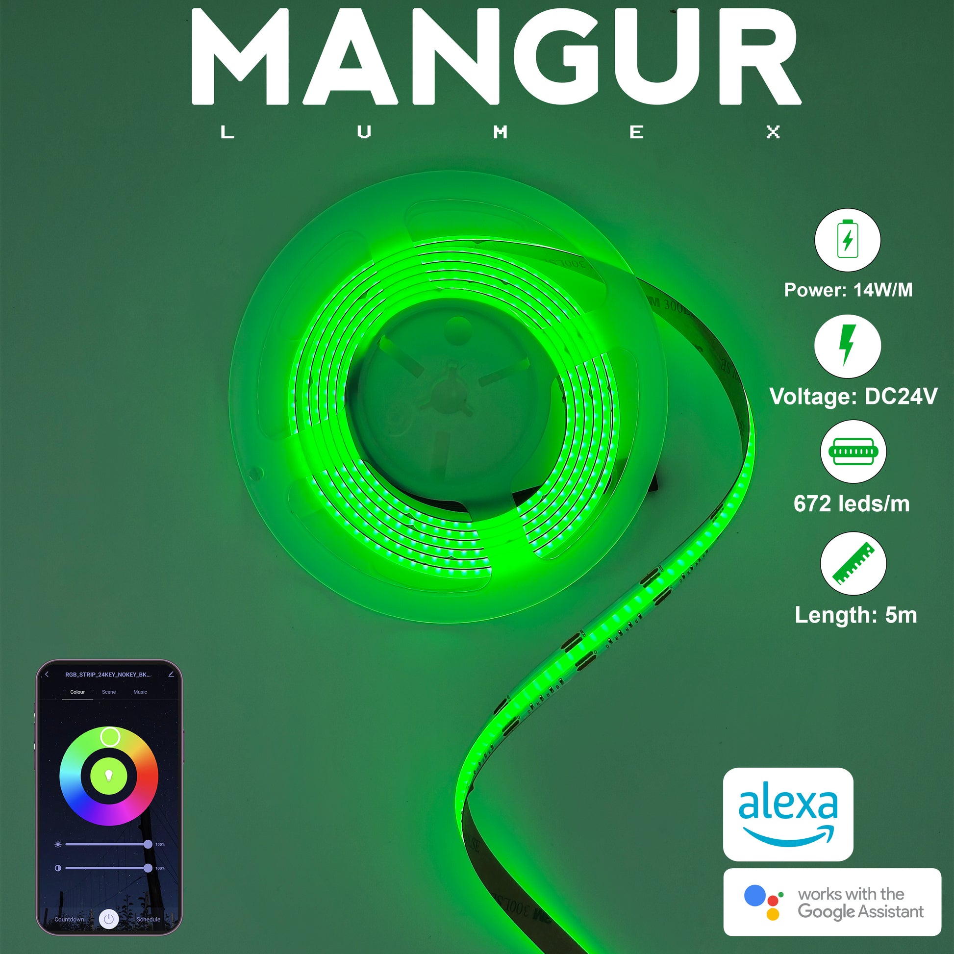 Striscia LED RGB COB 5M, 672 LED/M, 24V Smart, Dimmerabile e Compatibile con Alexa